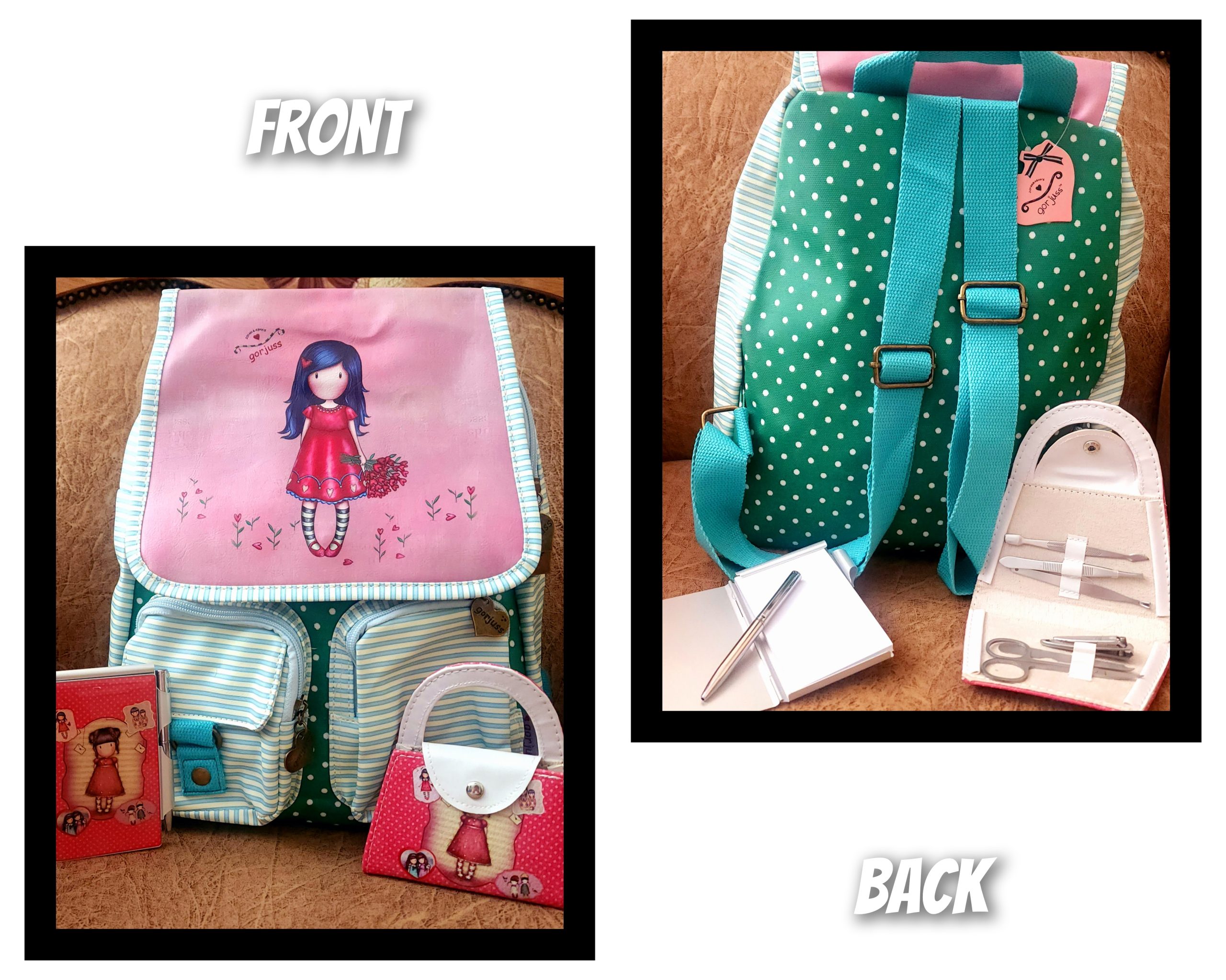 Combo includes the backpack, beautiful notebook with pen and nail grooming kit in a cute pouch.