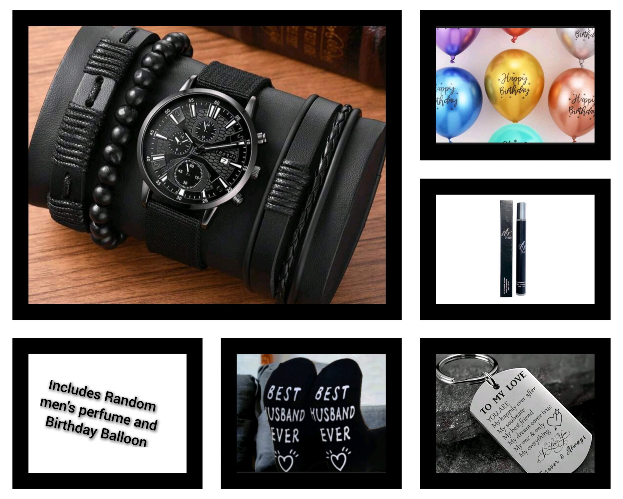 “Surprise your husband with FASH’s exclusive Men’s Husband Hamper featuring a stylish Watch Set and cozy Husband Socks, 35ml Perfume, a Birthday Balloon and a Keychain. Elevate your gifting game with this thoughtful and fashionable hamper designed to make every occasion special. The watch set adds a touch of sophistication to his wrist, while the comfortable husband socks ensure warmth and style. Embrace the joy of giving and show your appreciation with this curated hamper that speaks to his unique personality. Shop now at FASH and make a lasting impression with the perfect gift for your husband. Transform the way you express love and gratitude with our Men’s Husband Hamper – a delightful combination of style and comfort. Explore FASH for unique gifts that leave a lasting impact and redefine your gifting experience.”