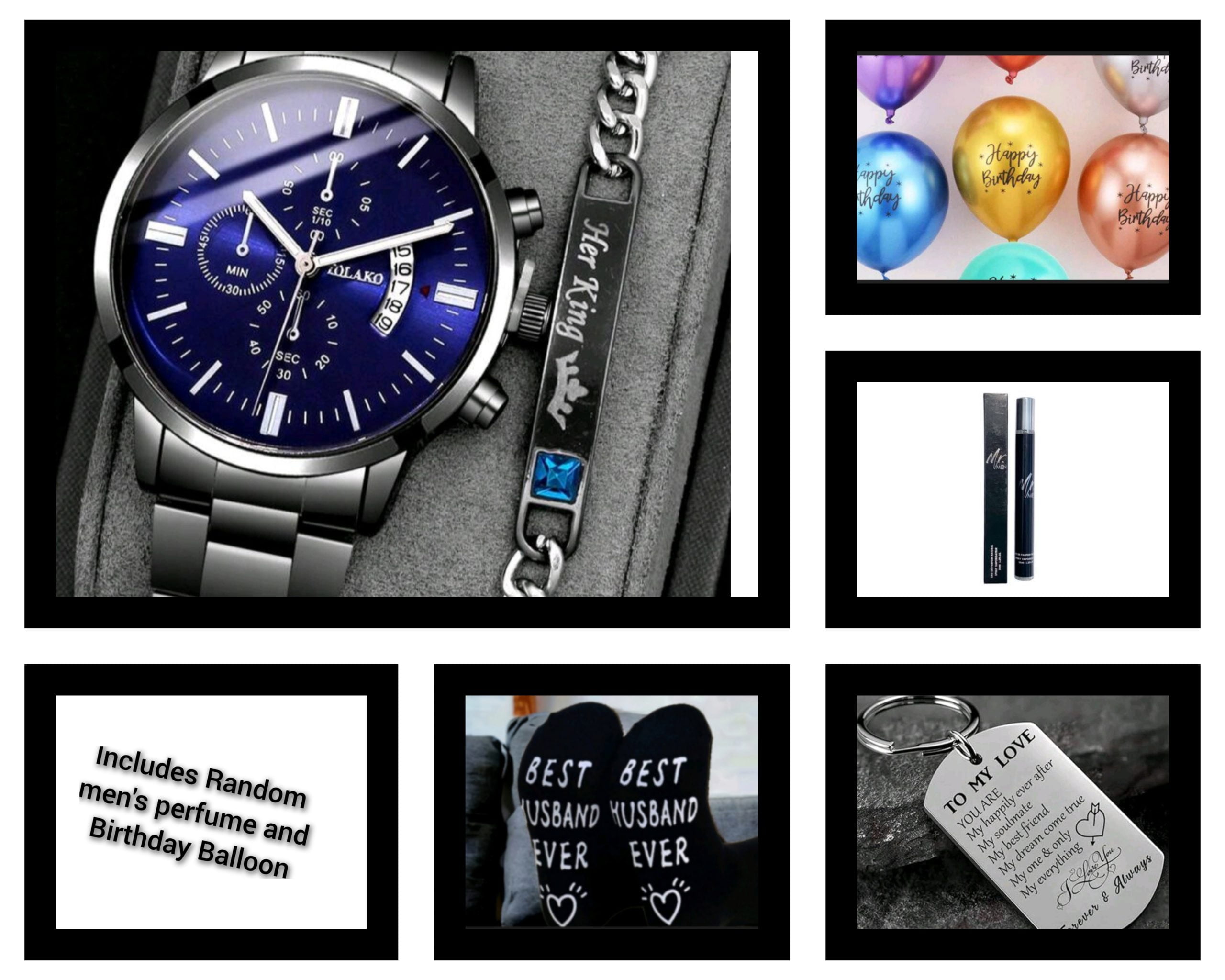 “Surprise your husband with FASH’s exclusive Men’s Husband Hamper featuring a stylish Watch Set and cozy Husband Socks, 35ml Perfume, a Birthday Balloon and a Keychain. Elevate your gifting game with this thoughtful and fashionable hamper designed to make every occasion special. The watch set adds a touch of sophistication to his wrist, while the comfortable husband socks ensure warmth and style. Embrace the joy of giving and show your appreciation with this curated hamper that speaks to his unique personality. Shop now at FASH and make a lasting impression with the perfect gift for your husband. Transform the way you express love and gratitude with our Men’s Husband Hamper – a delightful combination of style and comfort. Explore FASH for unique gifts that leave a lasting impact and redefine your gifting experience.”