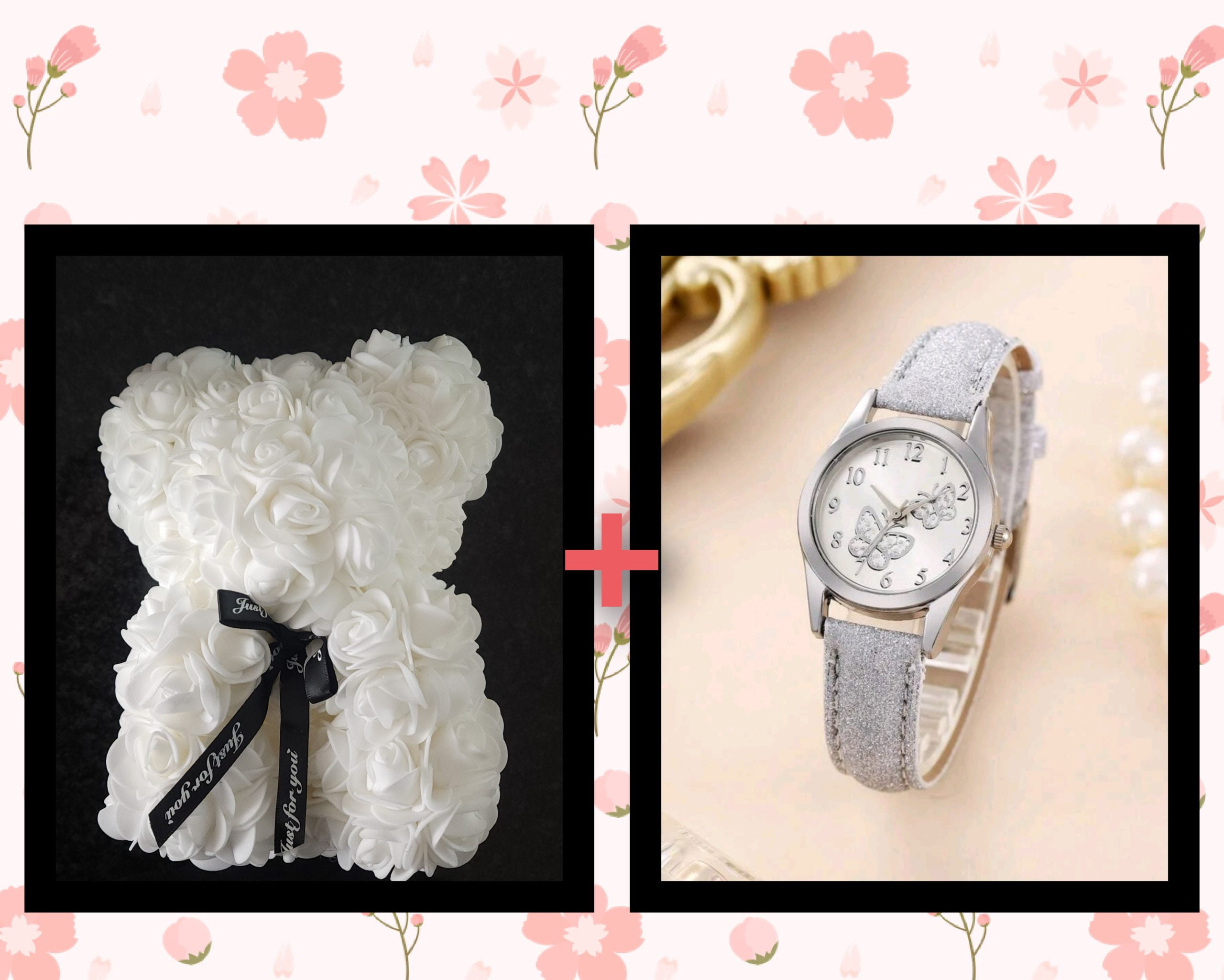 “Surprise your loved one with the exquisite FASH Artificial Rose Heart and beautiful watch set combo, the perfect romantic gift for Valentine’s Day, anniversary, birthday or any special occasion. Crafted with care and attention to detail, this enchanting bear is adorned with beautiful artificial roses, creating a timeless expression of love. A beautiful watch set adding an extra touch and making this gift even more special.Whether as a thoughtful decoration or a unique love gift, this gift speaks volumes. Elevate your celebrations with a touch of romance and elegance. Made to be cherished, this gift is a symbol of enduring love and a lasting memory. Shop now at FASH and make every moment unforgettable. Embrace the sentiment of love with our Artificial Rose heart and watch set combo, a heartfelt gesture that goes beyond words. Order yours today and let love bloom in the most beautiful way possible.”
