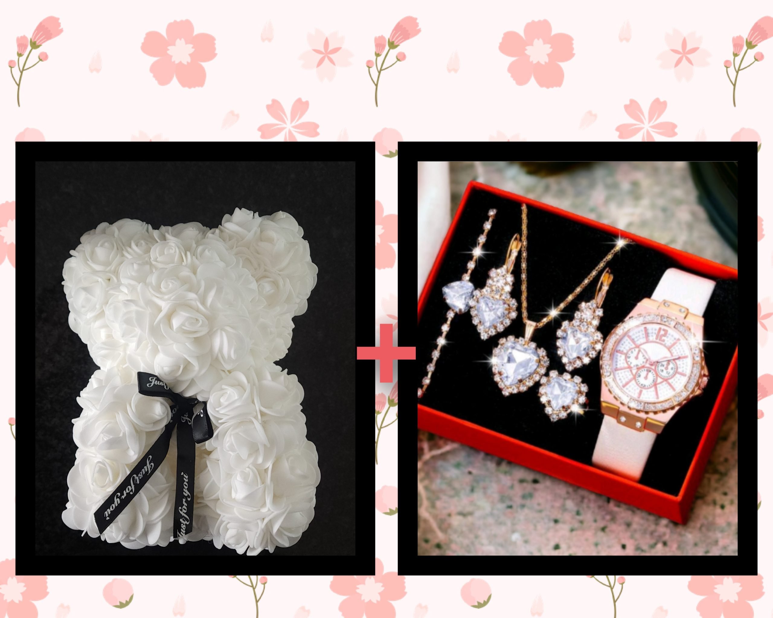 “Surprise your loved one with the exquisite FASH Artificial Rose Heart and beautiful watch set combo, the perfect romantic gift for Valentine’s Day, anniversary, birthday or any special occasion. Crafted with care and attention to detail, this enchanting bear is adorned with beautiful artificial roses, creating a timeless expression of love. A beautiful watch set adding an extra touch and making this gift even more special.Whether as a thoughtful decoration or a unique love gift, this gift speaks volumes. Elevate your celebrations with a touch of romance and elegance. Made to be cherished, this gift is a symbol of enduring love and a lasting memory. Shop now at FASH and make every moment unforgettable. Embrace the sentiment of love with our Artificial Rose heart and watch set combo, a heartfelt gesture that goes beyond words. Order yours today and let love bloom in the most beautiful way possible.”