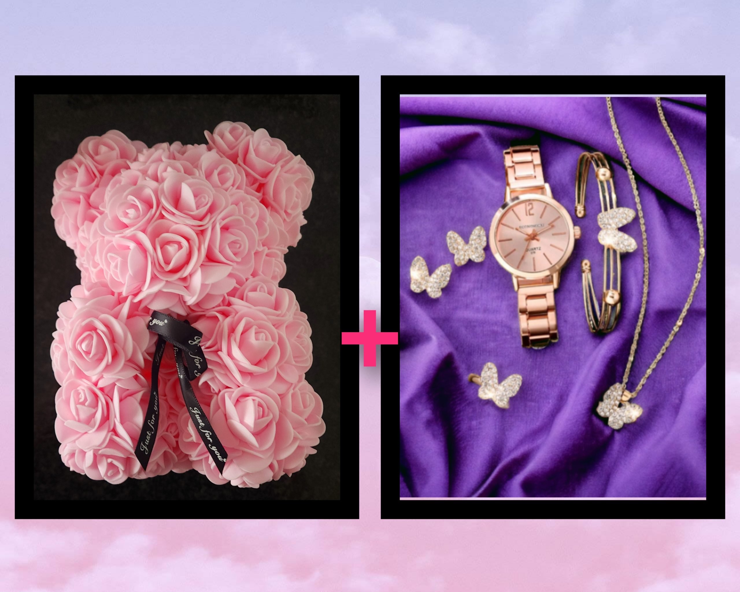 “Surprise your loved one with the exquisite FASH Artificial Rose Heart and beautiful watch set combo, the perfect romantic gift for Valentine’s Day, anniversary, birthday or any special occasion. Crafted with care and attention to detail, this enchanting bear is adorned with beautiful artificial roses, creating a timeless expression of love. A beautiful watch set adding an extra touch and making this gift even more special.Whether as a thoughtful decoration or a unique love gift, this gift speaks volumes. Elevate your celebrations with a touch of romance and elegance. Made to be cherished, this gift is a symbol of enduring love and a lasting memory. Shop now at FASH and make every moment unforgettable. Embrace the sentiment of love with our Artificial Rose heart and watch set combo, a heartfelt gesture that goes beyond words. Order yours today and let love bloom in the most beautiful way possible.”